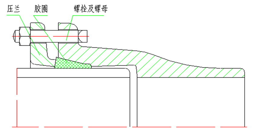采用T型接口的密封結構,通過焊環、擋環、壓蘭相互配合和鉤頭螺栓緊固實現自錨,允許工作壓力為1.0MPa、1.6MPa和2.5MPa。