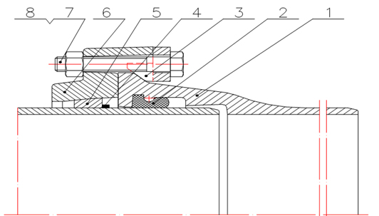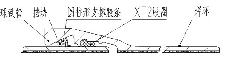 1.球鐵管;2.T密封圈 3.替代勾頭斜壓塊;4;焊環;5、擋環;6、壓蘭;7、高強度螺栓及螺母