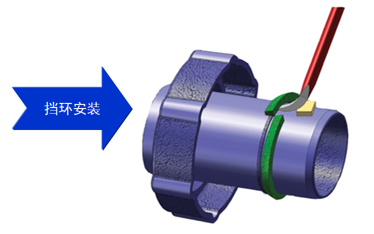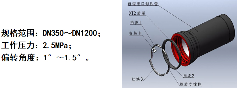 采用T型接口的密封結構,通過分塊擋環(擋塊)與承口內增加的擋塊室的配合利用焊環實現錨固連接;主要應用C25級別的DN1400~2000自錨管,DN1400~1800偏轉角為1°,DN2000偏轉角為0.5°。