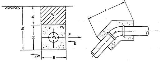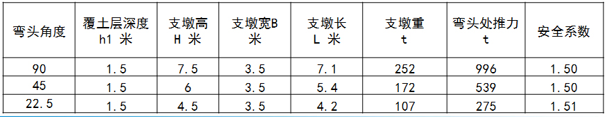 大型管道工作壓力大,相應支墩大,并且工期長,如果設定土壤條件為:密度為1.6t/m3,摩擦系數為0.5,內摩擦角為30°,覆土層厚度為1.5m,假定DN1800口徑的鑄管,在2.5MPa的試驗壓力。 22.5°和90°彎頭處按1.5倍的安全系數進行混凝土支墩設計,如果混凝土密度按照2.3t/m3計算,支墩尺寸為: