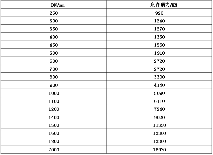 2)下表適用于普通土壤,土壤的內摩擦角為30°,打壓壓力為10Bar,安全系數為1.2,普通金屬鋅涂層或金屬鋅和普通終飾層的埋地管線。